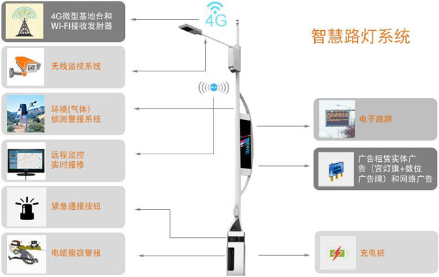二、作为智慧城市的数据入口,集成了智能照明,LED显示屏,安防监控,微环境检测,一键报警,充电桩,无线wifi,交通信号灯等功能。